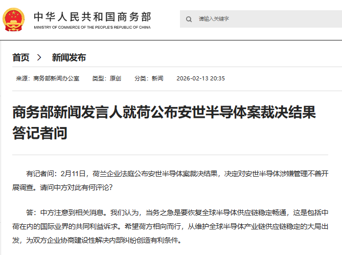 上证报中国证券网讯据商务部2月13日音问,商务部新闻发言东说念主就荷公布安世半导体案裁决成果答记者问。
