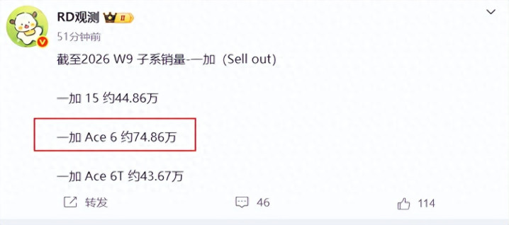 最近RD不雅测公布的一加新机销量数据,就把这个推行透彻评释白了:一加Ace6销量约74.86万台,接近75万,不仅压过一加15和一加Ace6T,还径直坐上一加新机销量王的位置。说真话,这个后果我极少都不虞外,因为一加Ace6自己等于那种“看参数很猛,用起来更猛,价钱还不离谱”的手机。