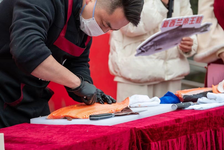 本届年货节上,六大“江杨好物”齐集亮相,成为市民抢购的焦点。智利拉宾斯车厘子(3J-4J)果色深紫满盈,咬下已而汁水与甜香迸发;KINGRIVER澳洲和牛眼肉牛排带着细致的大理石斑纹,是年夜饭硬菜的优选;滋长在南极结净海域的新西兰君王鲑,肉质橘红紧实,进口香醇软糯。上海渠洋国外营业的张师父现场开鱼切片,刀刃划过鱼肉的已而鲜味扑鼻。“原价300多元一斤的君王鲑,年货节现场径直打7折,重迭市集优惠券后差未几能享近5折!”实惠力度让不少市民马高低单。