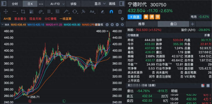 4月20日晚间,宁德期间发布鼓动询价转让订价情况教导性公告,经向机构投资者询价,上述股权转让初步细则的转让价钱为410.34元/股。此价钱比较宁德期间的最新收盘价(432.5元/股)折价约5%。