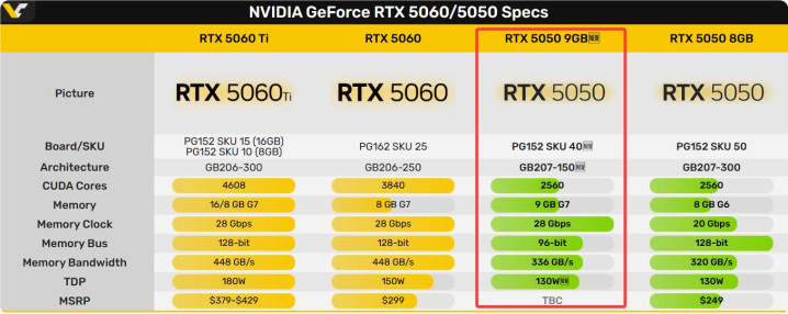 提到 GeForce RTX 5050 9GB GDDR7 版,校服巨匠最蔼然的问题是:除了显存有升级除外,这款显卡的其他中枢规格(如光栅单位、张量内核等)是否有变化?全体是升级更多,依然存在隐性左迁?